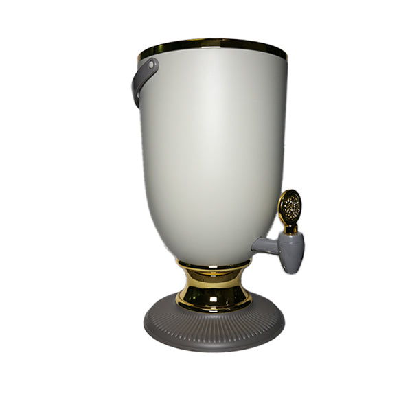 Introducing the Forever Gold 5.5 Liter Plastic Juice Dispenser Grey & Gold, an essential addition to any event. With a large 5.5 liter capacity, this dispenser is perfect for serving refreshing beverages to large groups. Made with durable plastic and accented with gold details, it is both functional and stylish.